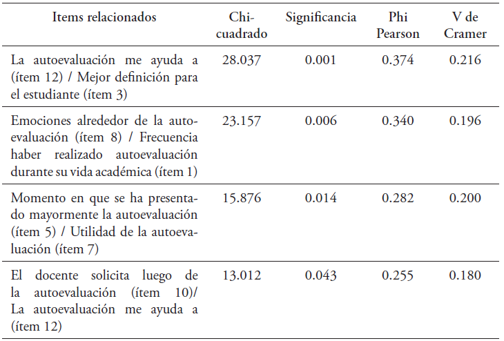 Con respecto a las correlaciones encontradas entre los ítems, se presenta la Tabla 1 con los valores de Chi-cuadrado, el valor de significancia, el valor de Phi de Pearson y de V de Cramer.