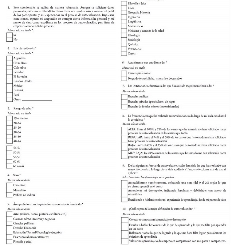 Instrumentos. Se utilizó el “Cuestionario sobre autoevaluación del aprendizaje” (Gallardo & Caicedo, 2022), el cual valora la percepción y experiencias durante los procesos de autoevaluación del aprendizaje de estudiantes de educación superior con fines de optimización educativa. Su administración puede ser individual o colectiva, así como presencial o digital. El cuestionario, en su versión digital, posee dos secciones: siete ítems de interés demográfico y 13 ítems sobre la autoevaluación propiamente dicha. Estas fueron preguntas cerradas con respuestas múltiples, además de incluir la pregunta sobre el consentimiento informado. Todos los ítems fueron de respuesta obligatoria.