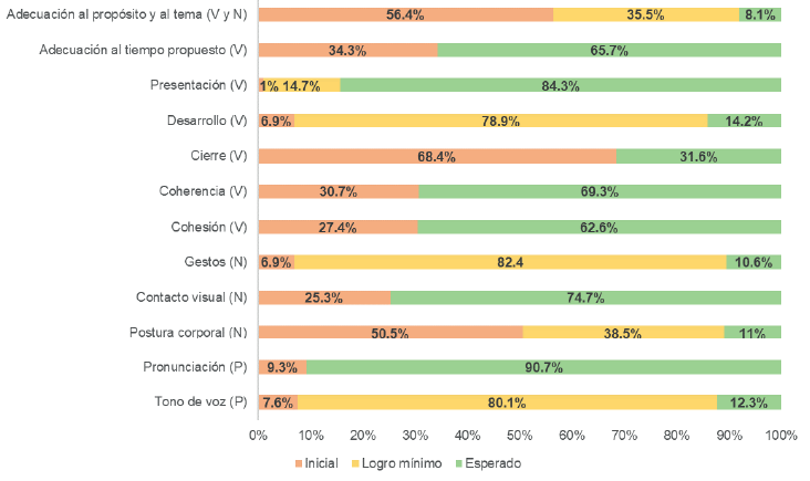 En términos generales, los estudiantes tienen un mejor desempeño en el aspecto paraverbal que en los demás aspectos, es decir, existe un mayor porcentaje de estudiantes en el nivel “esperado” en el aspecto paraverbal (51.5%), seguido por el aspecto verbal (38%) y, finalmente, el aspecto no verbal (26.1%). Sin embargo, debe considerarse que existen criterios que poseen distribuciones variadas, al interior de cada aspecto