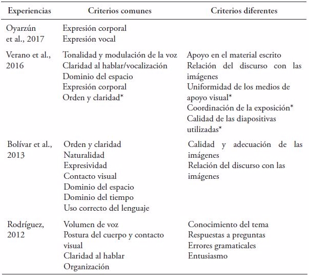 En relación con la comunicación oral, en las pocas experiencias reportadas sobre la evaluación de esta competencia en educación superior, se incluyen aspectos verbales, no verbales y paraverbales, los cuales promueven y acompañan el mensaje que se desea brindar (Bolívar et al., 2013; Oyarzún et al., 2017; Rodríguez, 2012; Verano et al., 2016). Dentro de los aspectos antes señalados, se identifican algunos criterios comunes como el orden y claridad de las ideas, la tonalidad, la modulación y el volumen de voz, la claridad al hablar y la vocalización, la postura del cuerpo y el dominio del espacio, la expresión corporal y el contacto visual. En la Tabla 1, se presentan con mayor detalle los criterios comunes y diferentes que se identificaron en estos estudios.