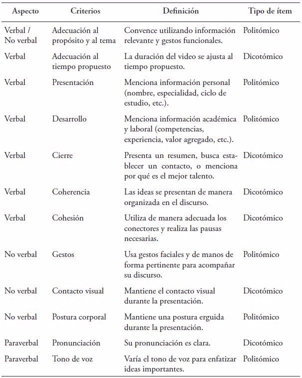 Se elaboró una consigna y una rúbrica analítica de evaluación. En primer lugar, en la consigna se planteó a los estudiantes la elaboración de un producto llamado CV online. Para ello, los estudiantes grabaron un video con el propósito de convencer a un posible empleador de contratarlos para un puesto laboral. En este video, debían mencionar su información personal, sus principales competencias, su experiencia laboral y el valor agregado que brindarían a la empresa. Dicha consigna plantea una situación auténtica de evaluación (Wiggins y McTighe, 2005), ya que, en los actuales procesos de selección, muchas empresas solicitan el envío de vídeos de presentación. Por otro lado, en la rúbrica analítica se presentaron los criterios desagregados en acciones observables y medibles que permitieron evaluar el desempeño de los estudiantes (Verano et al., 2016). En total, se usaron 12 criterios que consideraron aspectos verbales, no verbales y paraverbales. Cabe señalar que seis criterios tenían tres niveles de logro (“inicial”, “en desarrollo” y “logrado”) y seis criterios eran dicotómicos (“inicial” y “logrado”). En la Tabla 2, se presenta cada uno de los criterios y su definición, así como el aspecto de la comunicación oral al que corresponden.
