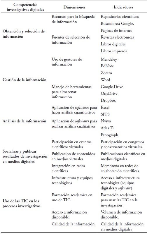 Investigadores utilizan diferentes denominaciones para referirse a estos saberes, competencias tecnológicas investigativas (CTI) o competencias digitales investigativas (CDI). En este estudio se enfatizan los saberes de la investigación utilizando las TIC. Por ello, adopta los términos competencias investigativas digitales (CID), e incluye dimensiones como la recolección y selección de información, el manejo de información, el uso de herramientas de análisis de información, la socialización y publicación de resultados de investigación en medios digitales, así como las ventajas y desventajas del uso de las TIC en el proceso de investigación (George & Salado, 2019; Nava et al., 2021; Sánchez & Veytia, 2015). Este tipo de competencias se pone en ejecución cuando los estudiantes realizan actividades como navegar en redes informáticas para encontrar, descubrir, visualizar y procesar información digital, confirmando así los resultados de sus investigaciones con otros profesionales (George & Salado, 2019). En la Tabla 1 se observa la clasificación de competencias investigativas digitales con sus dimensiones e indicadores.