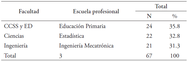 La muestra intencional estuvo constituida por un grupo de estudiantes de la Facultad de Ciencias Sociales y Educación, Facultad de Ciencias y Facultad de Ingeniería Industrial de la universidad mencionada en una cantidad de 67 en total. En la Tabla 2 se observa el número de estudiantes por carrera profesional.