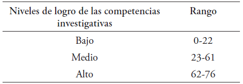 Los resultados demuestran la existencia de un problema en cuanto al logro de las competencias investigativas, puesto que el 94.03 % de los estudiantes presentan niveles de bajo a medio, el mismo que se debe atender para lograr mejorar el logro de dichas competencias investigativas a un nivel alto.