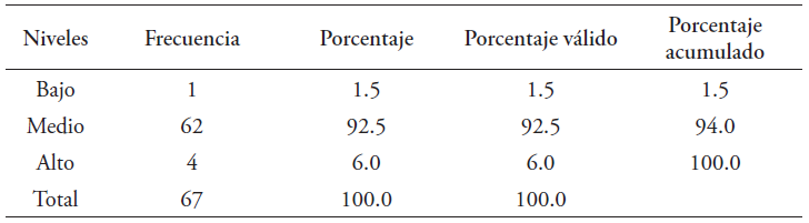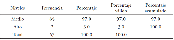 De acuerdo con el resultado de la Tabla 5 se observa que la mayoría de estudiantes (97.01 %) lograron ahora obtener un nivel medio en las competencias investigativas con la utilización de los PLE. Además, un porcentaje (2.99 %) de estudiantes presentan un nivel alto. Por otra parte, no se observa a ningún estudiante que posea un nivel bajo en el aprendizaje de las competencias evaluadas con la utilización de los PLE, lo cual evidencia que se produjo una mejora importante en su aprendizaje.