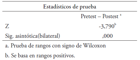 Para determinar las diferencias significativas en los resultados de la evaluación de las competencias investigativas obtenidas en el pretest y postest, se eligió la prueba estadística no paramétrica Wilcoxon para dos muestras relacionadas, considerando un nivel de significancia de α = 5 % (0.05).