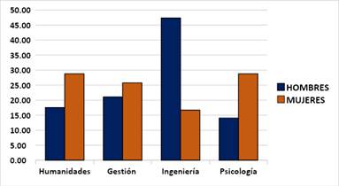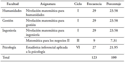 Como se puede ver en la Tabla 1, los de Ingeniería concentran la mayor cantidad de participantes porque se consideraron dos grupos: uno que desarrolla el curso Nivelación matemática y el otro, Matemática para los negocios II. Así mismo, Humanidades y Gestión tienen la misma cantidad de estudiantes.