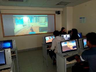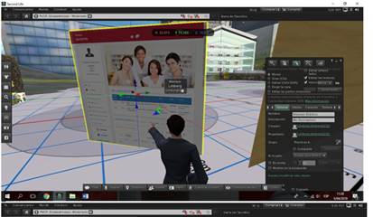 La primera corresponde a la adecuación de los laboratorios de cómputo. Se instaló el visor de SL en todos los ordenadores disponibles con ayuda técnica del personal de Soporte de Tecnología e Informática y el permiso del jefe de laboratorios de la Universidad Tecnológica del Perú, sede Chiclayo. Posterior a ello, se inició la exploración en SL equipando el ambiente con objetos interactivos didácticos. Los docentes tutores tuvieron conocimiento en el dominio para diseñar herramientas de construcción en SL. Por ejemplo, construyeron una pizarra interactiva y un televisor didáctico con acceso a internet (ver Figura 3).