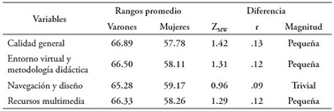En la Tabla 5, se evidencia una diferencia de magnitud pequeña (.10 ≤ r =.13 < .30) en la calidad general de las asignaturas de ciencias con un rango promedio mayor en los estudiantes varones (RP = 66.89) respecto de las mujeres (RP = 57.78); de igual manera se muestra una diferencia de magnitud pequeña en las dimensiones entorno virtual y metodología didáctica (.10 ≤ r =.12 < .30) con un rango promedio mayor en los estudiantes varones (RP = 66.50) respecto de las mujeres (RP = 58.11) y recursos multimedia (.10 ≤ r =.12 < .30) con un rango promedio mayor en los estudiantes varones (RP = 66.33) respecto de las mujeres (RP = 58.26); sin embargo, no existe diferencia entre varones y mujeres en la dimensión navegación y diseño.