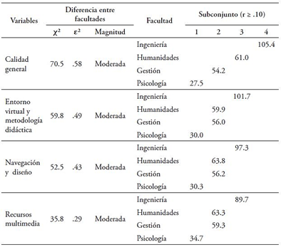 La Tabla 6 evidencia una diferencia de magnitud moderada (.25 ≤ ε² =.58 < .64) en la calidad de asignaturas de matemáticas y estadística, formándose cuatro subgrupos con un rango promedio, de mayor a menor en los estudiantes de las facultades de Ingeniería (RP = 105.4), Humanidades (RP = 61.0), Gestión (RP = 54.2) y Psicología (RP = 27.5), respectivamente. De igual modo, se muestra una diferencia de magnitud moderada en las dimensiones Entorno virtual y Metodología didáctica (.25 ≤ ε² =.49 < .64), Navegación y diseño (.25 ≤ ε² =.43 < .64) y Recursos multimedia (.25 ≤ ε² =.29 < .64), formándose tres subgrupos para cada una de estas dimensiones, donde los estudiantes de Ingeniería obtienen un rango promedio superior, seguido del subgrupo formado por los estudiantes de Humanidades y Gestión, y el tercer subgrupo con un rango promedio inferior en los estudiantes de Psicología.