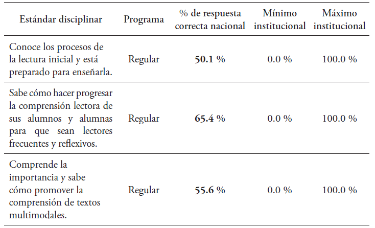 En cuanto a los estándares que apuntan a la competencia lectora y su enseñanza, los porcentajes de respuestas correctas no alcanzan niveles óptimos en alumnos regulares de Pedagogía Básica (ver Tabla 1).