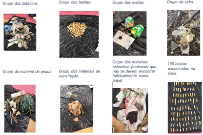 Desta forma, deu-se início à segunda atividade proposta pelas crianças, a ida à praia com o objetivo de participar na proteção do planeta através da recolha de lixo presente no areal. Nesta ida à praia as crianças mostram-se extremamente empenhadas e entusiasmadas durante a recolha de resíduos. A observação atenta dos comportamentos das crianças permitiu constatar que estas efetuavam uma recolha consciente do lixo, conseguindo identificar o que eram resíduos e o que eram recursos naturais. Com esta recolha de resíduos procurou-se despoletar nas crianças a curiosidade e o interesse pelo que as rodeia, estimulando-lhes o interesse por observar, colocar questões e estimular a procura de soluções para situações problemáticas. Durante a recolha de resíduos, a educadora foi interagindo com as crianças colocando-lhes questões sobre o que recolhiam, de forma a perceber se identificavam o lixo humano e os recursos naturais. As crianças perceberam a importância do património natural, reconhecendo a necessidade da sua preservação, sendo que surgiram afirmações como: “Esta praia estava muito suja. As pessoas não podem poluir tanto” (J.); “Olha este vidro! Se um peixe comesse ele morria” (L.); “Aqui estão tantas beatas. As nossas praias estão a ficar muito sujas, as outras praias também estão assim” (T.) e “Existe tanto lixo, será que o planeta vai morrer?” (M.). De regresso ao jardim escola, em grande grupo conversou-se sobre os materiais recolhidos. Neste tempo de interação verbal, as crianças referiram os resíduos recolhidos e o que sentiram ao fazê-lo: “eu recolhi muitos plásticos e também muitos microplásticos” (F.); “eu apanhei uma luva de lã, muito estranho” (H.); “eu apanhei fios de pesca que havia muitos” (T.) e “eu apanhei muitas beatas” (G.).