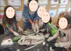 As crianças assumiram um papel ativo na preparação da exposição discutiram, sobre o local onde dinamizar a exposição, bem como o que e como pretendiam expor. Para além de comunicarem com as famílias, o grupo também decidiu apresentar o projeto a uma das salas da instituição. Neste momento verificou-se que o grupo explicou o desenvolvimento do projeto, tendo nomeadamente referido: “esta é a nossa exposição” (M.), “fomos à praia apanhar lixo” (F.), “e estamos a fazer um projeto sobre o lixo” (J.) e “não podemos mandar lixo para o chão” (A.). Nesta apresentação as crianças demonstraram um desenvolvimento das suas capacidades comunicativas, conseguindo fundamentar e argumentar as suas opiniões, afirmando: “os animais assim morrem” (S.), “se mandarmos lixo para a praia, os peixes pensam que é comida e depois comem e depois quando vamos comer peixe, comemos microplásticos que não conseguimos ver” (H.) e “se comermos lixo podemos ficar doentes e morrer” (M.).