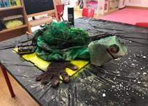 Animados com o exemplo de Bordalo II, as crianças, em pequenos grupos iniciaram o processo de criação artística, com os respetivos resíduos. À medida que iam manipulando os objetos surgiram imensas ideias, como: “este saco gigante que encontrámos pode ser a carapaça da tartaruga” (J.) e “esta coisa da pesca também pode ser na carapaça, porque elas quando ficam presas elas depois podem morrer” (F.). Com um pedaço de esferovite construíram o rosto, com duas rolhas os olhos e com um balão, a boca. Durante a construção a V. afirmou: “Falta o pescoço, e se construirmos com esta garrafa verde?”. Ao auxiliar as crianças neste processo, a educadora conseguiu escutar o seu sentir. Considerou-se maravilhoso a cooperação e os comentários que faziam: “olha, aqui este plástico fui eu que recolhi ..., mas não faz mal se não metermos na nossa escultura” (T.) e a “olha, nós podíamos por assim pedaços de plásticos, o Bordalo ele também mete, fica giro!” (M.). O último grupo ficou responsável por construir as patas da tartaruga e tentaram construir uma pata diferente e estranha, tal como o lixo encontrado. Uma vez que o grupo ficou bastante intrigado com um dos objetos encontrados na praia, uma luva de lã, esta ficou bem destacada na escultura, sendo a pata direita da tartaruga. Por fim, o grupo decidiu, que tal como o Bordalo II, também poderiam pintar com spray a escultura, ficando a carapaça verde e as patas castanhas.