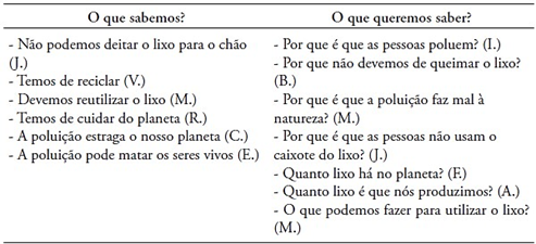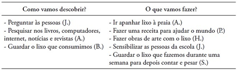 O aben de respostas construídas pelas crianças participantes, na procura de soluções para a proteção do planeta, faz-se num primeiro momento, pela partilha de ideias e conhecimentos, relativamente à poluição e ao impacto que esta tem no nosso planeta, bem como estratégias e aben og para a sua prevenção. Assim, num primeiro momento registaram-se as ideias das crianças num quadro, sendo que ao longo deste registo procurou-se escutar as suas opiniões, ajudando-as a formular as suas questões e conhecimentos. A intencionalidade educativa, subjacente a este momento, passou por levar as crianças a falar sobre o que já sabiam e o que gostavam de aben og sobre esta problemática, potenciando um conhecimento sobre o mundo e a responsabilidade Esta ação vai ao encontro do que é defendido pelos autores defensores da metodología de projeto, pois é na fase I que se formulam o problema e as questões a investigar, se definem as dificuldades a resolver e o assunto a estudar. Efetivamente este é o tempo que se “partilham-se os saberes que já possuem sobre o assunto; conversa-se em grande ou pequeño grupo, as crianças desenham, esquematizam, escrevem com o apoio do adulto” (Vasconcelos et al., 2012, p.14).