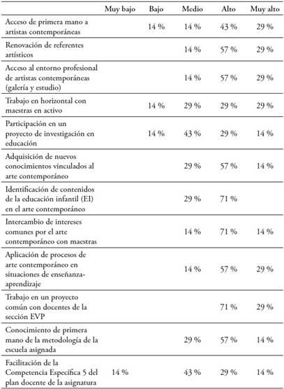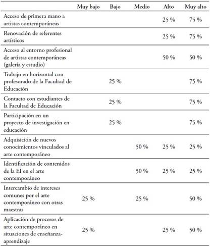 Las maestras destacan los aspectos que hacen referencia al acceso a artistas contemporáneas (75 % “muy alto”, 25 % “alto”) para valorar, a continuación, las situaciones de trabajo con la Facultad de Educación (75 % “alto”, 25 % “bajo”).