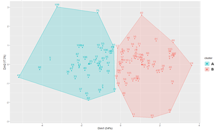 Dentro del análisis de conglomerados se obtuvieron dos nuevos clústeres, el clúster A conformado por 66 personas y el clúster B, por 44 personas (Figura 1). Este agrupamiento de datos conforma una combinación de los cinco tipos de emprendedores denominados como hacedores (M1), mercaderes (M2), magos (M3), movilizadores (M4), másteres (M5); así, se pudieron diferenciar estadísticamente dos grupos de estudiantes que comparten características emprendedoras similares entre ellos, con lo cual se le da soporte a la primera hipótesis al haber logrado agrupar más de un grupo distinto entre sí y característico de la UNALM para el curso de Desarrollo Empresarial, es decir, existen al menos dos grupos que comparten características similares de emprendimiento.