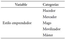El estilo hacedor posee una gran capacidad de enfrentar y resolver problemas, generar estrategias y herramientas que complementen el resultado (Adedeji et al., 2018). El estilo mercader, que aprovecha oportunidades, es persuasivo y se vale de estrategias para influir en otras personas; usa personas claves para lograr sus objetivos y mantiene siempre una amplia red de contactos (Velasco, 2009). El estilo mago, refiere al tipo de emprendedor visionario que se encuentra en una constante generación de ideas y que se adelanta a las tendencias del momento enfocándose en el producto o servicio que será clave en el futuro; para ello, le es necesario mantener orden y claridad apropiada durante la estructuración de ideas para no perder el horizonte frente a un problema (Leadbeater, 2016). El estilo movilizador, por su parte, no apunta hacia la resolución de un problema sino a la conversión de estos en oportunidades de negocio ya sea a nivel social o carácter global como los problemas ambientales3 (Murillo-Luna et al., 2021). Por último, se encuentra el estilo máster cuyas habilidades y conocimientos son de amplia gama y que tienen una gran capacidad de influencia en el entorno donde radican (Drodi & Wright, 2018).