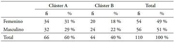 Para desarrollar la segunda hipótesis se presentaron los valores descriptivos obtenidos en el agrupamiento por clúster tomando en cuenta la variable género con una distribución de 49 % de mujeres y un 51 % de varones en la Tabla 3. En el caso del clúster A se contó con mayor presencia de mujeres que varones y las características predominantes fueron aquellas contenidas en los estilos movilizadores y máster. Para el clúster B se obtuvieron más varones que mujeres, donde las características de hacedores y máster fueron las más predominantes.