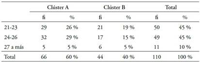 A pesar de que la población mayoritaria la conformaron estudiantes de 21 a 26 años, según la Tabla 4, el 90 %, el clúster A tuvo mayor porcentaje de estudiantes con edades de 24 a 26 años. El clúster B presenta un caso diferente, que coincidió en concentrar a la edad más predominante (21 a 23 años) de la muestra. Este resultado nos indica que la edad, de alguna u otra manera, ha sido un factor de clasificación relevante en la agrupación de las características del estilo emprendedor en los estudiantes del curso de Desarrollo Empresarial.