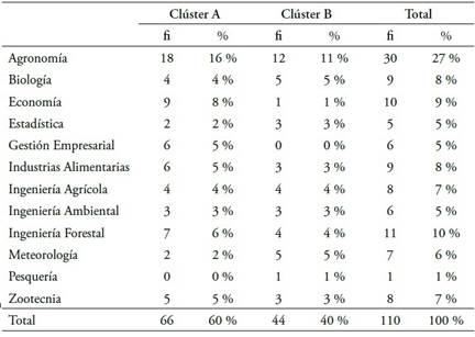 Respecto de la Tabla 5, las carreras profesionales predominantes fueron Agronomía con un 27 %, Ingeniería Forestal con un 10 % y Economía con 9 %. En el clúster A, las carreras predominantes fueron Agronomía, Economía e Ingeniería Forestal, mientras que en el clúster B las predominantes fueron Agronomía, Biología y Meteorología.