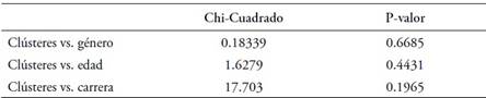 Los análisis estadísticos realizados permitieron identificar la existencia de la relación entre los clústeres y la edad, el género y la carrera. Según el p-valor mostrado en la Tabla 6, a un nivel de significancia del 0.05, ninguna de las relaciones resultó significativa, por lo que se evidencia estadísticamente que no existe relación entre los clústeres con el género, la edad y la carrera.
