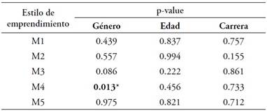 También, se encontró que, si bien gráficamente las variables de género, edad y carrera de origen lograron marcar diferencias en cada clúster analizado, estadísticamente solo se puede afirmar que el género resultó significativo en el estilo de emprendimiento movilizador que, en su mayoría, fue obtenido por las mujeres. Por lo tanto, los grupos de emprendedores de la UNALM son similares en conjunto, pero es posible marcar tendencias de diferenciación a causa de las variables descritas.