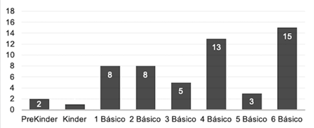 De los profesores participantes de esta investigación, 15 corresponden a profesores de sexto año básico (27.3 %), el cual constituye el curso con más cantidad de respuestas, seguido por el cuarto año básico, correspondiente a 13 de las respuestas dadas (23.6 %). El detalle de los cursos se puede observar en la Figura 1.