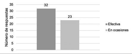 La percepción de los profesores sobre la efectividad de las estrategias utilizadas para manejo de los problemas de conducta en el aula se obtuvo mediante la pregunta “¿considera que las estrategias utilizada para el manejo de los problemas de conducta son efectivas?”, cuyas opciones dadas fueron “sí”, “no” o “en ocasiones”. El 58.2 % de los profesores percibe las estrategias utilizadas como efectivas (32 respuestas), mientras que el 41.8 % de los profesores percibe las estrategias utilizadas como efectiva en ocasiones (véase Figura 2).