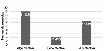 El análisis descriptivo sobre las intervenciones establecidas por la escuela y la percepción de los profesores sobre la efectividad de estas se muestran a continuación. De los 35 profesores que utilizan las estrategias de intervención establecidas por la escuela, 18 considera que estas son “algo efectivas” (51.43 %), mientras que 13 profesores indican que “son muy efectivas” (37.14 %) y solamente cuatro de los profesores señalan que “son poco efectivas” (ver Figura 3).