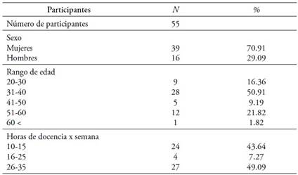 Al inicio del estudio, se recopilaron 86 cuestionarios, de los cuales 31 fueron excluidos al no estar respondidos en su totalidad. Solo 55 sujetos fueron incluidos en el análisis, de los cuales un 29.1 % fueron varones (16) y un 70.9 % mujeres (39), de edades entre 20 y 40 años. El cuestionario fue respondido por profesores de prekínder a sexto básico2