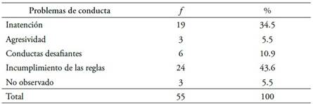 De los problemas de conducta observados en el aula, el incumplimiento de las reglas es el problema que se observa con mayor frecuencia dentro de la sala de clases. Este problema fue identificado por 24 de los profesores (43.6 %), seguido por los problemas de inatención (34.5 %), mientras que la agresividad fue identificada por el 5.5 % de los profesores (ver Tabla 2).