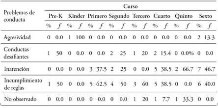 Adicionalmente, la comparación del tipo de conducta observado dentro de cada curso muestra que, dentro del sexto básico, el 46.7 % de los profesores identifica la inatención como el problema de conducta más frecuente, mientras que 40 % de los profesores observa que el incumplimiento de las reglas es el problema de conducta que se observa con mayor frecuencia. El curso que señala tener más estudiantes con problemas de incumplimiento de las reglas es el primer año básico, el cual corresponde al 62.5 % de las respuestas dadas. En la Tabla 4, puede observarse que, dentro del mismo curso, los profesores señalan diferentes problemas de conducta observados en sus estudiantes.
