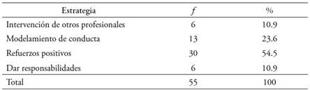 De las estrategias utilizadas por los profesores como técnica de intervención ante los problemas de conducta observados en el aula, el refuerzo positivo fue identificado como la estrategia utilizada con mayor frecuencia dentro del aula, ya que comprende el 54.5 % de las respuestas (30 respuestas). Asimismo, el dar responsabilidades a los estudiantes y acudir a la intervención de otros profesionales, fueron técnicas identificadas como intervención y utilizadas por el 10.9 % de los participantes (verTabla 5).