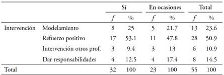 Adicionalmente, al comparar el tipo de intervención con la percepción de los profesores sobre su efectividad, se observa que el refuerzo positivo es la estrategia de intervención percibida por los profesores como la estrategia más efectiva (53.1 %), seguida por el modelamiento de la conducta (25 %). Sin embargo, podemos observar que el 47.8 % de los profesores percibe el refuerzo positivo como “efectivo en ocasiones” , como puede apreciarse en la siguiente tabla: