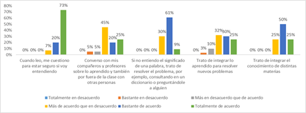 Sobre el análisis de los territorios educativos en relación con las dimensiones del compromiso académico, advertimos que la agencia, en los tres territorios, se observa (Figuras 3 a 5) una fuerte presencia de respuestas en las opciones “más en desacuerdo que de acuerdo” y “bastante de acuerdo”. Si bien prevalece la segunda opción antes mencionada en los tres primeros ítems, en los últimos dos, comentar gustos y realizar sugerencias para mejorar la clase, predomina el desacuerdo por sobre el acuerdo, en un 30 % o más de las respuestas dadas.