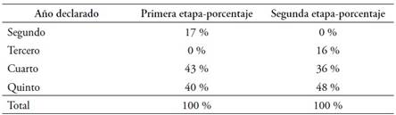 Con respecto a la primera etapa, participaron del estudio 56 estudiantes de las carreras de Profesorado y Licenciatura en Educación Inicial de la Universidad Nacional de Río Cuarto. La totalidad de la muestra fue de sexo femenino, cuya edad promedio era de 25 años (SD=7). El 43 % de las estudiantes transitan el cuarto año, el curso con el mayor número de estudiantes. En la siguiente tabla se puede observar en detalle la distribución por año de la carrera que estaban cursando.