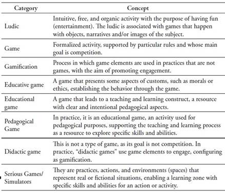 Despite the agreement that in order not to limit knowledge, concepts should not stagnate or crystallize, it is sound practice to establish definitions so that knowledge can be structured and organized, making it solid, explicit, and practicable. The conceptual delimitation between ludic, game, and gamification, as well as educative games, educational games, pedagogical games, and serious games, therefore follows the singularity of their origins. However, it is possible to establish more specific characteristics, considering their application in practice, how this is structured, and the objective of the practice.