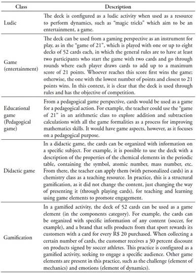 To illustrate this argument, we took as an example the use of a deck of playing cards, which can be used in various practices. The deck can be used in a game, such as poker, “buraco”, “truco”, “sueca”, “twenty-one”, which have their own rules, which can vary depending on the region and culture. However, the fundamental objective of all these games is competition. Hence the cards can be used in other activities, such as magic tricks, in an entertainment activity, in a ludic way (Santos & Almeida, 2018), without being characterized as a game.