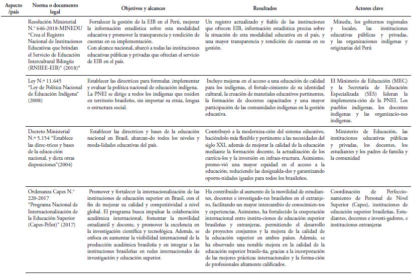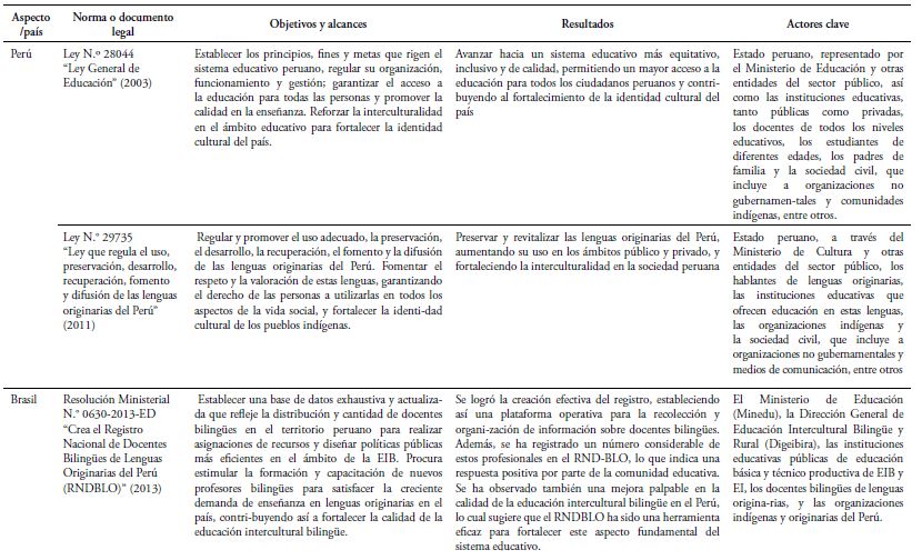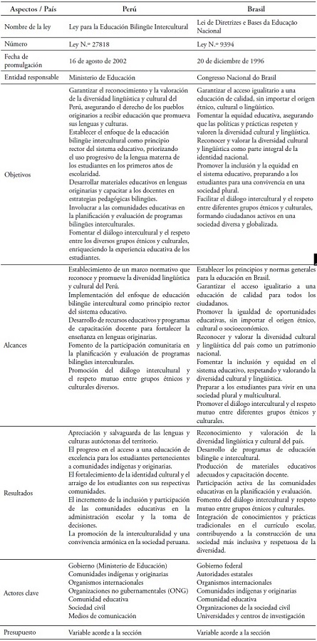 En ese contexto, en la Tabla 1 se detallan las leyes base propuestas por los Gobiernos del Perú y Brasil, concerniente a la promoción de la educación bilingüe.