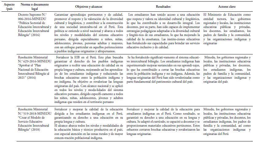 En julio de 2016, el Gobierno peruano emitió el Decreto Supremo N.º 006-2016-MINEDU, mediante el cual se estableció la Política Sectorial de Educación Intercultural y Educación Intercultural Bilingüe. Esta política reafirmó el compromiso del gobierno con el fomento de una formación incluyente que reconozca y aprecie la pluralidad de culturas e idiomas del país (Yates & Núñez, 2021).