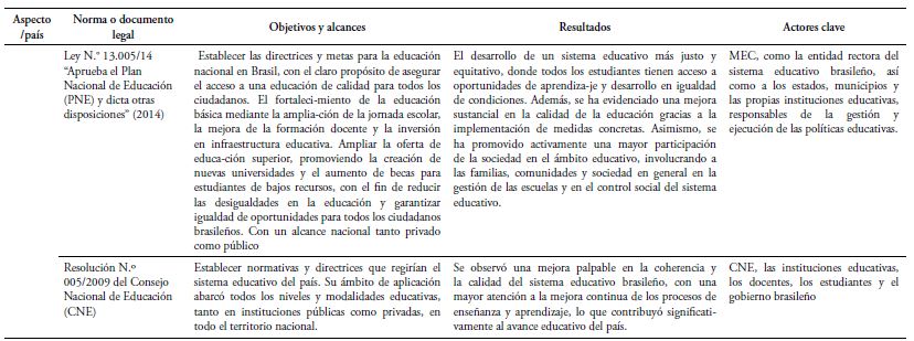 Por esta razón se optó por la Ley N.º 27818 y Ley N.º 9394 del Perú y Brasil, respectivamente, que sentaron las bases para la promulgación de normas y/o documentos legales con el fin de fomentar y estimular la formación en dos idiomas, en el nivel de educación media, en los países analizados, como se detalla en la Tabla 2.