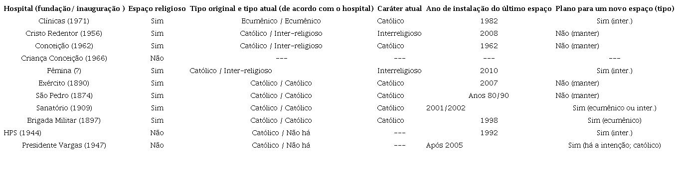 Este processo de desconfessionalização é um fenômeno recente, da primeira década do século XXI. O quadro abaixo apresenta os onze hospitais públicos de Porto Alegre com o ano de sua fundação ou inauguração e o perfil dos respectivos espaços religiosos até 2012.