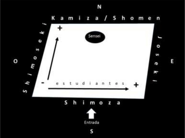 En los dōjōs argentinos la orientación según los puntos cardinales no es algo que se tenga en cuenta. La ubicación del shomen (正面, principal + cara-superficie, o sea “frente”) o frente del dōjō es bastante frecuente que sea la opuesta al acceso, pero hay casos en los que el acceso es por un lateral. La ubicación jerárquica de los laterales en algunos dōjōs se puede presentar invertida pero la que muestra el diagrama es la más usual. Las flechas muestran la forma en que está cualificado jerárquicamente el espacio: el frente (shomen) o espacio “elevado” (kamiza, 上座, arriba + asiento) es de más jerarquía que el “fondo” o sitio “más bajo” (shimoza, 下座, abajo + asiento). El lado derecho visto desde el fondo (joseki) es más importante que el izquierdo (shimoseki). Se muestra en el esquema las posiciones del maestro (sensei) y los estudiantes durante los saludos formales que marcan el inicio y fin de cada clase. Los estudiantes se alinean en fila con el de menor graduación en el lateral shimoza y el de mayor graduación en el joseki (a igual graduación se usa la antigüedad en la práctica y luego la edad como criterio).