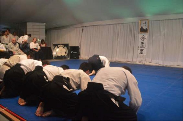 El dōjō, en el sentido específico de tatami o espacio de práctica, es percibido claramente por los practicantes como un lugar especial. Diversos mecanismos verbales y no verbales marcan este carácter. La mayoría de los mismos son aprendidos por los estudiantes mediante la imitación y la percepción sensible, que es el medio principal de transmisión en el Aikido. Por una parte, hay una clara delimitación que se construye a partir del cambio de superficie (el tatami), y de los requisitos para acceder a la misma: usar -en la mayoría de los casos- una vestimenta particular1, descalzarse y saludar en dirección al kamiza, cuestión que desarrollaremos luego más extensamente. Pero además se trata de un espacio donde está prohibidas determinadas posturas (recostarse, apoyarse en las paredes, poner los brazos en jarra o en la cadera, etc.), y acciones (hablar en vos muy alta, realizar bromas o reírse). Estas prohibiciones son interiorizadas por la observación del comportamiento de los miembros más antiguos y reforzadas mediante escasos llamados de atención, y material escrito (en algunos casos un cuadro colgado antes del acceso al tatami con el reglamento del dōjō, o la lectura de libros o artículos sobre el Aikido). La clave rectora es el concepto de que quien entra al tatami entra a un espacio marcial, en el que tanto una actitud desafiante como una actitud descuidada quedan completamente fuera de lugar. En esa línea los movimientos que los practicantes realizan sobre el tatami -incluyendo la limpieza o el doblado de la ropa- denotan silencio, control, una gran atención puesta a cada uno de los detalles y un carácter formal. Esta serie de elementos genera un conjunto de signos sensibles que construyen la experiencia de un espacio-tiempo solemne y potente (Autor, 2011).