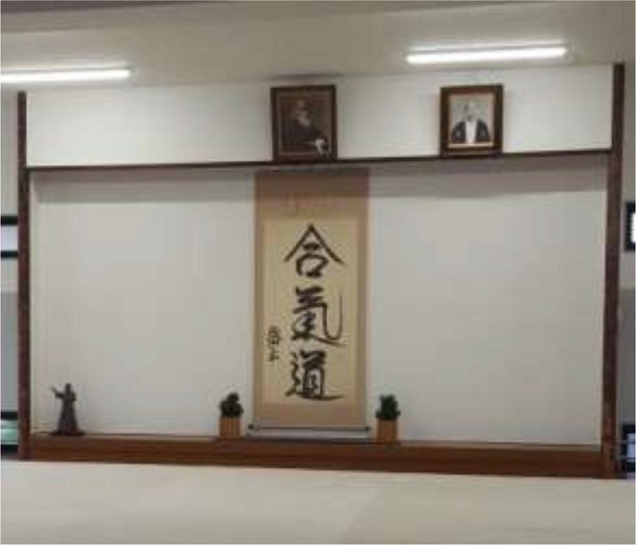 En la mayoría de los dōjōs en la pared del frente o shomen se ubica -a veces en un nicho en la pared o tokonoma (床の間)- un conjunto de elementos usualmente organizados alrededor de una fotografía de Ō-Sensei Morihei Ueshiba, el fundador del Aikido. A este conjunto en Argentina y en muchos otros lugares fuera de Japón se lo suele denominar “kamiza”. Pero como señalamos más arriba, estrictamente hablando el término kamiza (上座, arriba + asiento) designa a la zona junto a la pared del shomen o frente donde se sienta el sensei, ya que hace referencia a la tarima elevada que antiguamente había en ese sitio en las habitaciones de las casas samurái en Edo y donde se sentaba la autoridad de la casa. Es decir que es el “asiento” o posición de “honor”. Otros objetos que suelen estar presentes en los dōjōs de Argentina en esa posición son una inscripción en kanjis japoneses (kakemono) con el término Aikido o alguna frase alusiva; un bokken (sable de madera) y/o un jo (bastón de madera) -las dos armas tradicionales del Aikido-; y en algunos casos un arreglo floral. En algunos dōjōs se suman otros objetos como fotografías de otros maestros, incienso, o incluso puede tratarse de un kamidana (神棚, kami o deidad shinto + repisa) o “altar doméstico”, que incluye un shinden -imitación en miniatura del edificio de un templo-; un objeto o pergamino que se constituye como el soporte material de la presencia del kami; cuencos con sal, arroz y agua; velas, etc.