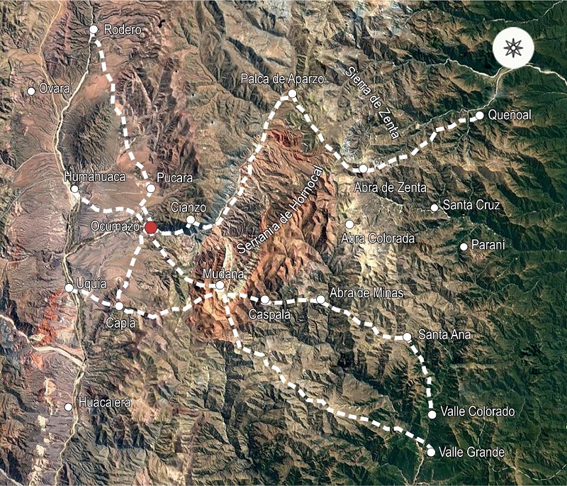 El área geográfica en la que se realizó el estudio está ubicada en el sector septentrional de la Quebrada de Humahuaca. Tomando la comunidad de Ocumazo como punto de referencia, dicha área quedó delimitada en base a la red de caminos que son o han sido utilizados por los entrevistados para llegar a localidades vecinas en el desarrollo de sus actividades cotidianas.