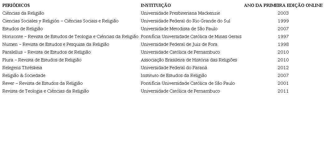 Para realizar este trabalho, foram selecionados os periódicos dos estratos A1, A2, B1 e B2, que apresentavam a palavra “religião” em seu título. A partir disso, foram selecionados os artigos que apresentavam a relação temática (gênero e religião) em seu título, resumo, palavras-chave e/ou em seu conteúdo. É importante destacar que, embora, outros periódicos abordem esta relação temática em alguns de seus artigos, como a Revista de Estudos Feministas e Cadernos Pagu, por exemplo, optamos por manter, para fins deste artigo, o recorte inicial como forma de estabelecer um panorama da produção. Por fim, cabe apontar que a coleta dos textos nos periódicos foi realizada no terceiro quadrimestre de 2017, sendo finalizada no final do mês de setembro.