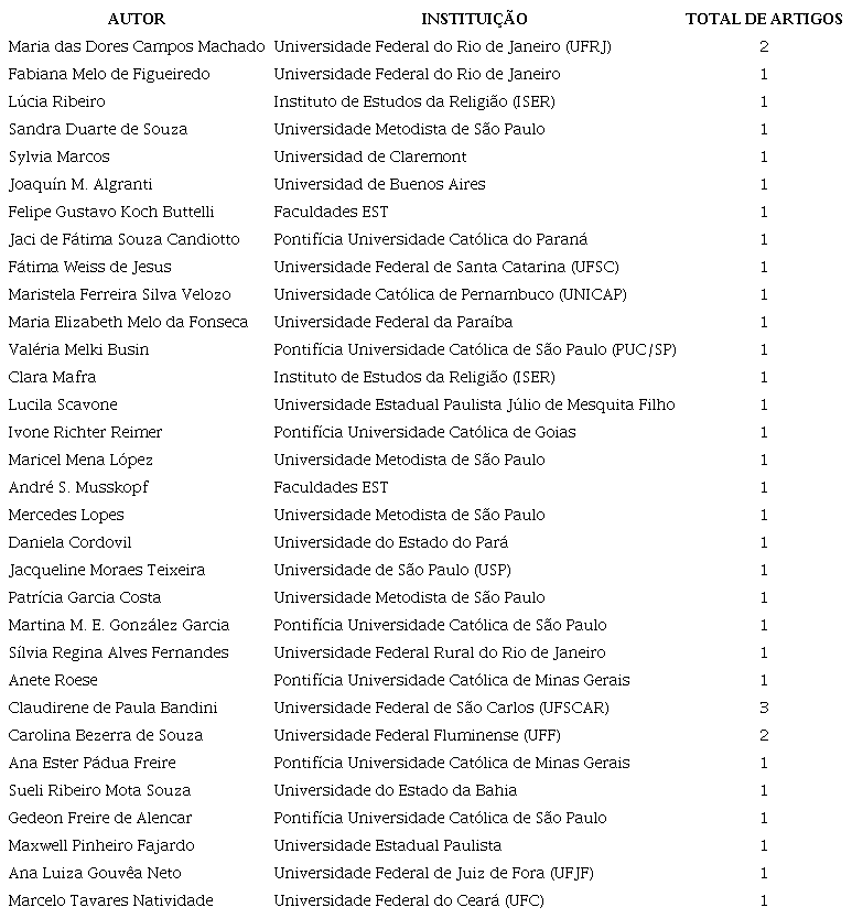 Fato que cabe ser destacado por nós é a autoria dos artigos que buscavam evidenciar as perspectivas de gênero e religião. Pudemos perceber que a grande maioria das publicações foi escrita por mulheres.