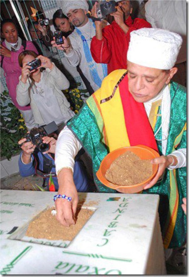 Pai Cleon esclarece que além da terra visível na parte superior do monumento, outra porção do “axé de Cabinda” se encontra debaixo do mesmo, servindo de fundamento: